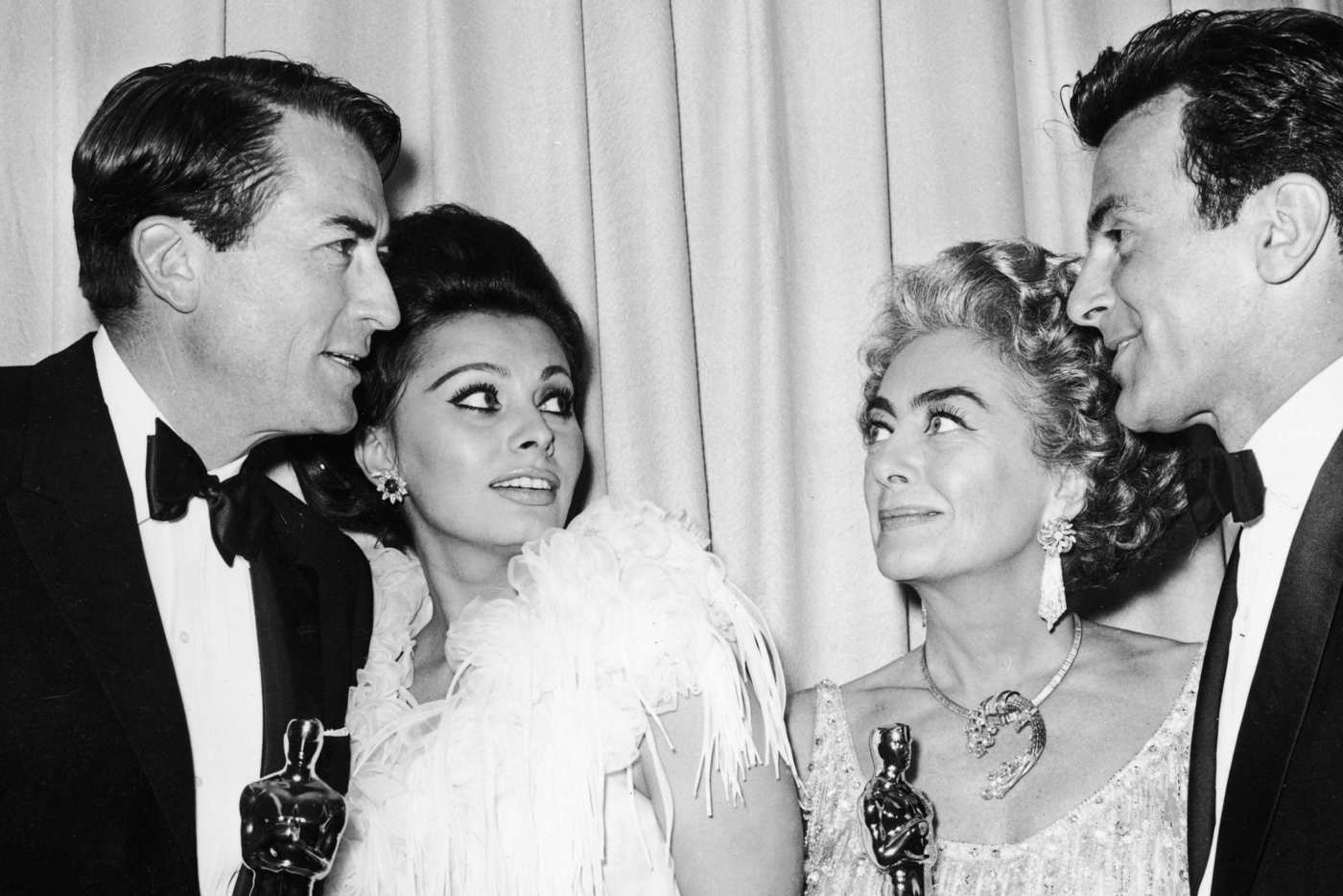 The Oscars have always had their controversies and backstories. Gregory Peck, Sophia Loren, Joan Crawford (accepting for Anne Bancroft), and Maximillian Schell at the 1963 ceremony, held at Santa Monica Civic Auditorium.