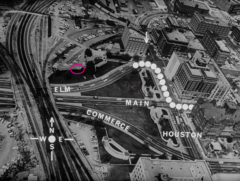 If you believe the Warren Commission report, nothing in Rush to Judgment will convince you otherwise. But if you’re not sure, or you don’t believe it, stick with this doc. It starts slow but builds to a consensus that directly contradicts and exposes the many flaws in the Commission’s motivation, process, and conclusions. For instance, as bystander after bystander after bystander, including WWII veterans, states their conviction that the shots that killed President Kennedy came from the train yard north of Elm Street (pink circle), it becomes abundantly clear that the Commission’s claim that the shots came from the Texas School Book Depository (white arrow ) is at best a mistake, and at worst, a deliberate lie, forged to support a predetermined solution to a crime. (Note that these people were testifying well before the Zapruder film was made available to the general public in 1975.) Few of these people were called before the Commission, and those who did appear were misquoted.