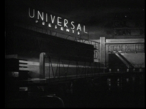 Godfrey‘s opening credits are very distinctive and very well-integrated with the storyline. The names (and titles, if necessary) of the cast and crew are designed like neon signs on buildings near the riverfront. The camera pans right, showing all the names in turn, ending on a painting of the city dump, where Godfrey, along with other “forgotten men,” makes his home. The painting dissolves into the first shot of the film.